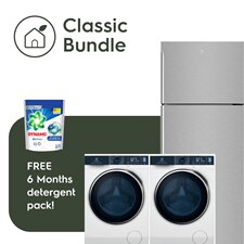 Inclusive of 3 appliances: 431L UltimateTaste 500 top freezer refrigerator; 10kg UltimateCare 500 front load washer (4 Ticks Water Efficiency); 8kg UltimateCare 500 heat pump dryer (5 Ticks Energy Rating)